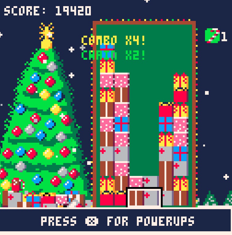 'Tis the season for this Pico-8 puzzler! Match gifts, dodge coal, and push your limits in the fast-paced Naughty Mode, or settle in for nearly-endless festive vibes in the cozy and forgiving Nice Mode. It's classic retro console match-3-or-more gameplay with 4 possible power-ups for a jolly arcade twist!